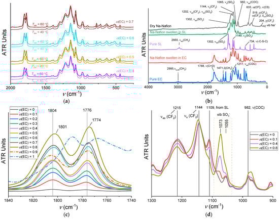 (a) The survey FTIR ATR spectra of Na-Nafion membranes swollen at 40 and 60 °C. (b) The survey FTIR ATR spectra of Nafion membrane dried over P2O5, initial solvents EC and SL and swollen Na-Nafion membranes. (c) Contours of the analytical band ν(C=O) of EC in the FTIR ATR spectra of swollen Na-Nafion. (d) Contours of the analytical band ν(SO) of the Na-Nafion (shaded area) in the FTIR ATR spectra of plasticized Na-Nafion.