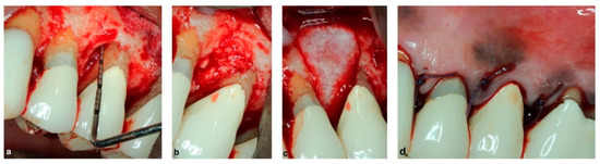 A therapeutically oriented classification of ridge deficiency has been proposed that considers the extent and type of both bone and soft tissue resorption and consists of three main categories: (1) horizontal (H), (2) vertical (V) or (3) combination (C) defects [44]. GBR has been demonstrated to be a predictable technique regardless of the type of the defect (H,V,C), and horizontal ridge augmentations have the advantage of a high implant survival rate and a low complication rate when using resorbable membranes [45,46]. Therefore, according to the literature, the most appropriate treatment choice for horizontal ridge augmentation is a resorbable membrane in conjunction with xenogeneic particulated grafting materials, which may be mixed with autologous bone chips at a surgeon’s discretion (Figure 6) [47].