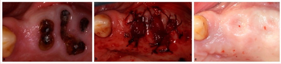 Alveolar ridge preservation with allogenic bone graft and collagen sponge: (a) extraction sites of posterior maxillary teeth, (b) bone graft placed into socket covered with collagen sponge, (c) extraction site healed with excellent keratinized gingival tissue with ideal dimensions preservation.