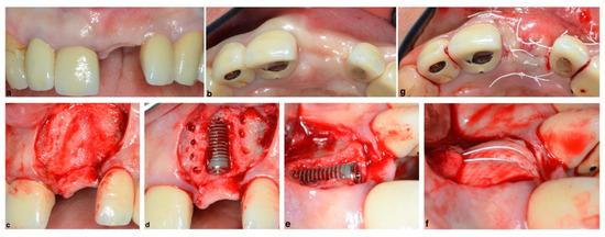 Classic horizontal ridge augmentation with a collagen resorbable membrane and xenogeneic grafting material mixed with autologous bone chips simultaneous to implant placement in the esthetic zone: (a) edentulous ridge, facial view; (b) edentulous ridge, incisal view; (c) soft tissue flap reflection with papilla sparing incisions where a horizontal defect was encountered; (d) implant placement and cortical perforation to allow for better blood supply to the graft, (e) horizontal ridge deficiency visible after implant placement; (f) bone xenograft + autologous bone chips (harvested form the nasal spine) and a resorbable collagen membrane placed and secured with strapping periosteal sutures; and (g) flap repositioned and secured with non-resorbable sutures.