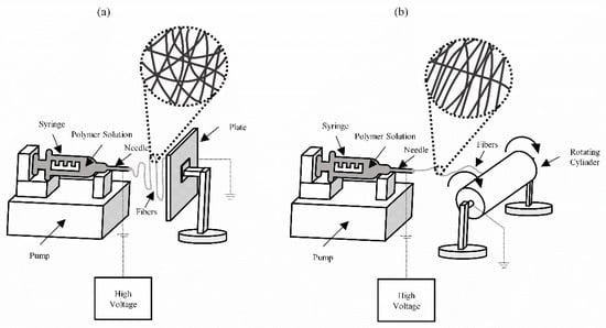 Electrospinning setups and collector types: (a) flat plate; (b) drum collectors.