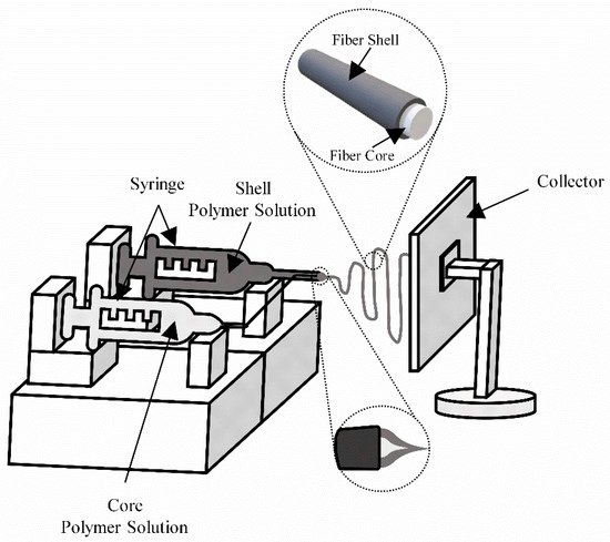 In general, two methods are most used for the production of core/shell nanofibers: emulsion and coaxial electrospinning. In emulsion electrospinning, an emulsion of two immiscible polymers is fed into a syringe with a capillary nozzle, while in coaxial electrospinning, the core and shell solutions are fed separately into a coaxial nozzle. Between those two, coaxial electrospinning is generally considered to be one of the most versatile methods for manufacturing these types of nanofibers [12].