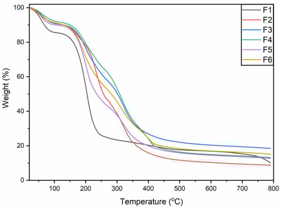 The thermogravimetric analysis (TGA) was performed to evaluate the thermal stability of the films (Figure 2). The weight loss occurred in three successive stages. The first stage of thermal decomposition/weight loss was from around 40 to 110 °C, which is associated with the evaporation of water [21]. Around 10% weight loss occurred during this stage in all samples except (F1), which underwent comparatively sharp weight loss compared to the rest of the preparations. This behavior of the films could be due to the addition of GEO or GE or both. Perhaps the addition of GEO or GE or both leads to this variation in the films compared to the blank film, F1 [20].