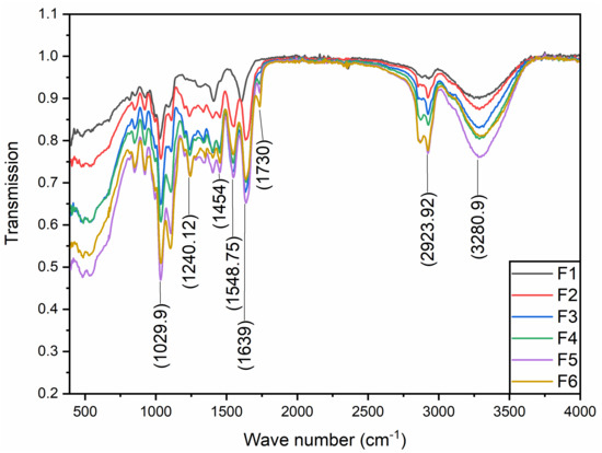 FTIR spectroscopy was performed to check the functional groups and chemical interactions between the gelatin, sodium alginate, and GEO. Moreover, this chemical assessment was utilized to draw a relationship between drying temperature and chemical interactions among the different components of the film (Figure 3). Since polymeric matrices of GE and GEs are enriched with amino, hydroxyl, and carboxylic functional groups, it is important to assess their chemical interaction among them as well as with phenolic components present in GEO [26]. Figure 3 shows the absorbance patterns of GE-based films dried at different temperatures. Overall, most of the FTIR band patterns of all the samples are similar (however, transmission intensity is different in all) except F1. Drying temperature has no significant impact on shifting band patterns but at the same time, it has an impact on shifting the wavenumber from lower to higher or higher to lower. This means that drying temperature as well as the addition of SA and GEO are impacting the chemical interaction of the film components.