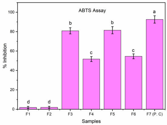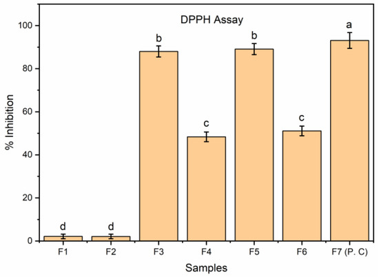 EFs were assessed for their ability to scavenge DPPH radicals using an earlier method [15]. The resultant supernatant solutions (F1–F7) were allowed to mix with an equivalent amount of DPPH solution using 96-well microplates. The solution obtained was subjected to incubation (30 min) at 37 °C with continuous mixing. A microplate reader was used to measure the absorbance using a blank preparation at 517 nm. BHT was utilized as a standard. The procedure was repeated three times and the mean was obtained. The percentage of inhibition was evaluated as per the following Equation (8):