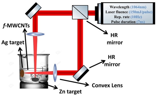 Zn pellet (Zn, BDH chemical Ltd. pool in UK) was used for the synthesis of ZnO nanostructured by pulsed laser ablation of cleaned Zn metal targets placed in a glass vessel filled with 5 mL of a solution of functionalized MWCNTs (f-MWCNTs) to produce the ZnO/MWCNTs nanocomposite, followed by repeating the previous procedure of pulsed laser ablation of another target, silver pellet (Ag, BDH chemical Ltd. pool in UK), immersed in the produced solution of the ZnO/MWCNTs nanocomposite. The functionalization procedure of MWCNTs was previously mentioned in the work of A. Mostafa et al. [39,40]. During this process, the laser beam of the Nd: YAG laser (λ = 1064 nm) with a 7 ns, a 10 Hz repetition rate, and 150 mJ of laser energy was focused on the surface of the target via convex lens for 10 min, as shown in the schematic diagram of the casting work in Figure 1.