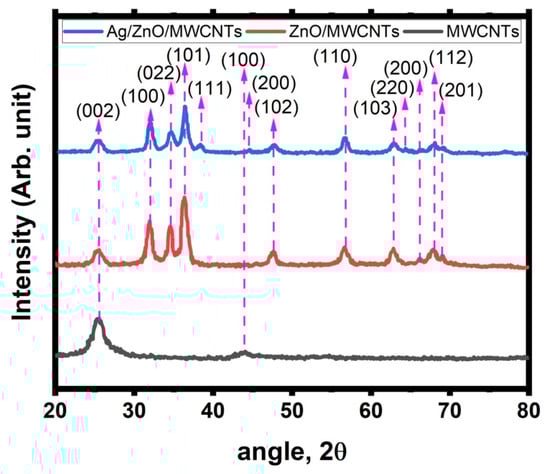 To verify the crystallinity and crystallite size, the XRD patterns of MWCNTs, ZnO/MWCNTs, and Ag NPs doped ZnO/MWCNTs nanocomposites were measured. The graphite structure of the MWCNTs is shown in Figure 2 along with how it developed in the diffraction patterns following embedding with ZnO NPs and then Ag NPs. The patterns demonstrate that the graphite structure coincided with the interplanar (002) of CNTs when the diffraction peaks at 26.10° occurred based on XRD card No. (PDF # 41-1487) [45]. Additionally, the diffractogram showed that MWCNTs decorated with ZnO NPs exhibit sharp peaks at 32.12°, 34.63°, 36.46°, 47.61°, 56.67°, 62.89°, 66.11°, 67.93°, and 69.01°. These diffraction peaks’ positions indicate the hexagonal wurtzite ZnO structure, since they correlate with the (1 0 0), (0 2 2), (1 0 1), (1 0 2), (1 1 0), (1 0 3), (2 0 0), (1 1 2), and (2 0 1) crystal planes, respectively, based on JCPDS card No. (36-1451) [46]. The diffractogram showed patterns with no additional diffraction peaks rather than a graphite structure and a ZnO structure. The sample was free of any impurities. The diffraction data clearly show that ZnO NPs had good crystallinity, with a predicted Scherer formula crystallite size of 22.5 nm. In other words, when Ag NPs were produced and doped with ZnO/MWCNTs, new diffraction peaks appeared at 38.41°, 44.47°, and 64.32°, respectively, corresponding to (111), (200), and (220), respectively, of the crystal faces of the silver structure, which was consistent with JCPDS card No. (65-2871) of the hexagonal wurtzite of the Ag structure [47]. It was concluded that the hybrids of Ag NPs doped ZnO/MWCNTs maintained the new crystal structure of the metal Ag, ZnO, and carbon nanotubes, which would be essential to guarantee the distinctive crystal structure and outstanding performance.