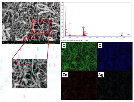 Figure 4 is the image of the SEM morphological analysis and elemental analysis of MWCNTs, ZnO/MWCNTs nanocomposite, and Ag-doped ZnO/MWCNTs. It shows that the image of the MWCNTs sample has smooth tubular shapes of the carbon nanotube structure, while the image of the ZnO/MWCNTs nanocomposite shows the tubular shape of MWCNTs decorated with highly distributed particles grown on their outer shape, whereas the image of the Ag-doped ZnO/MWCNTs nanocomposite shows that the amount of the distribution of particles on the tubular structure was increased, and the rate of roughness was increased, which was certainly related to the ablation of Ag metals and the embedding of another nanostructured material from the Ag nanostructured material. Moreover, the energy-dispersive X-ray (EDX) spectroscopy was used to examine the chemical purity and elemental composition of MWCNTs, ZnO/MWCNTs, and Ag doped with ZnO/MWCNTs. The EDX spectrum of the produced Ag NPs doped with ZnO/MWCNTs. The binding energies of Zn are associated, while the binding energies of Ag and oxygen are related to ZnO. Moreover, the presence of C is related to CNTs. Therefore, the EDX spectrum confirms that the synthesized hybrid structure contains the components Ag, Zn, C, and O [54,55].