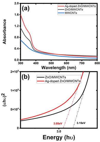 The generated samples’ optical characteristics have a significant impact on the photocatalytic activity. In this investigation, the effect of Ag NP doping and ZnO NP surface decoration on the optical characteristics of ZnO/MWCNTs was assessed using UV-VIS-NIR spectroscopy. The absorption spectra of three samples are shown in Figure 5a, showing Ag NPs doped with ZnO/MWCNTs exhibit the maximum light absorption in the 400–700 nm regions. The following equation can be used to calculate the products’ band gaps [56]: