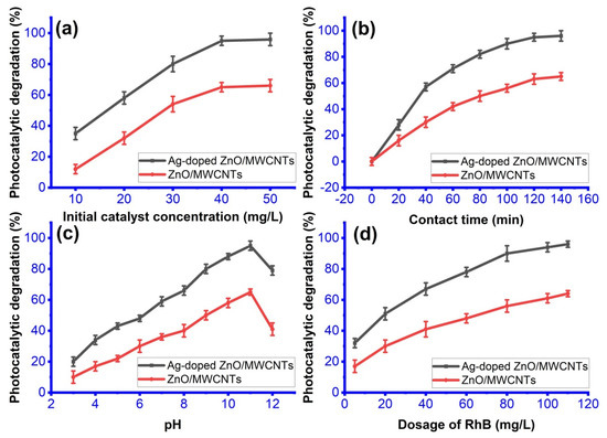 The outcomes are displayed in Figure 6a. RhB was rapidly removed when the catalyst concentration was increased from 10 mg to 50 mg, rising from 12.44% and 35.29% of 10 mg to 40.01% and 95.53% of 40 mg for ZnO/MWCNTs and Ag-doped ZnO/MWCNTs, respectively. As the elimination percentage rises, the amount of pollutants that can be degraded per unit mass of the catalyst progressively reaches its maximum, and as the catalyst concentrations rise further, the ability to improve degradation efficiency is severely constrained. Therefore, in this experiment, a catalyst dosage setting of 40 mg is ideal [11,12].