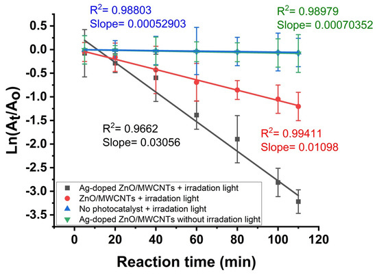 Absorption kinetic via pseudo-first order against RhB in the presence and absence of photocatalyst (ZnO/MWCNTs and Ag-doped ZnO/MWCNTs) and irradiation light.