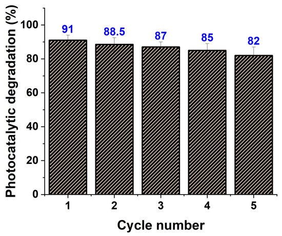 In addition, the photocatalyst’s stability and usability are critical in real-world applications. As a result, after five consecutive cycles of UV irradiation (Figure 9), the photocatalytic performance of ZnO/MWCNTs with decorating Ag NPs was examined. The results showed that the photocatalytic performance of Ag NPs doped ZnO/MWCNTs was greater than 80% after five subsequent cycles, indicating its stability and reusability for practical applications. The losses in the degradation efficiency of the prepared nanocomposite in the reusability experiments were due to a decrease in the active sites on the nanocomposite’s surface from using NaOH, which peeled its active areas, leading to the tendency of the catalyst to agglomerate, mass loss, and some disintegration during the recovery process of the catalyst [75].