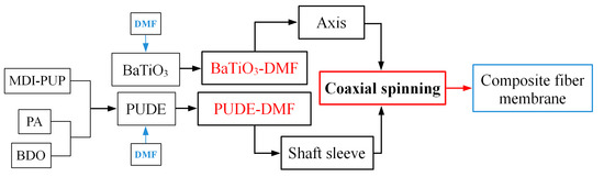 As shown in Figure 2, the PUDE is prepared by mixing at 70 °C in the proportions of MDI-PUP, PA, and BDO of 100, 30, and 12.8, respectively. Then, the metered PUDE and BaTiO3 are dissolved or mixed with DMF to prepare the PUDE solution and BaTiO3 suspension (the mass ratio of PUDE:DMF of 1:5, the mass ratio of BaTiO3:DMF of 1:1000/2:1000/3:1000). Next, the above two solutions are loaded into the shaft sleeve and shaft channel of the coaxial spinning device, respectively. Four kinds of polyurethane composite fiber membranes with the mass ratio of PUDE:BaTiO3 of 100:0, 100:0.5, 100:1.0, and 100:1.5 were obtained by adjusting the coaxial spinning parameters. The principles of the coaxial spinning technology are shown in Figure 3.