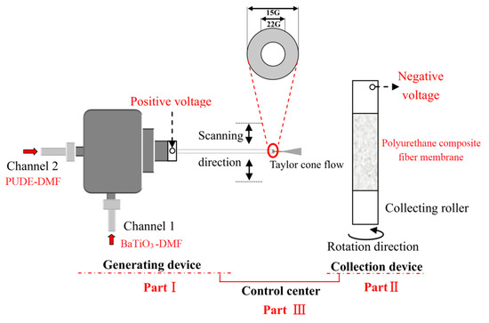 As shown in Figure 3, the coaxial spinning device is composed of three parts: fiber generation, fiber membrane collection, and control. Specifically, the liquid ejected from the spinning head will form a Taylor cone flow under the action of high voltage that will be collected on the collection roller. During that time, the morphology of the composite fiber membrane and the filling state of BaTiO3 can be controlled by adjusting the voltage, the scanning speed, the ejection speed, the speed of the collection roller, and the environmental factors (temperature and humidity) of the device. In this way, the polyurethane composite fiber membrane with the target morphology can be obtained. After adjustment, the main coaxial spinning parameters are as follows: spinning solution concentration 20%, pushing speed 0.7 mL/h, voltage 12.5 kV, spinning head size 22 G, humidity no more than 25%, temperature no more than 55 °C.
