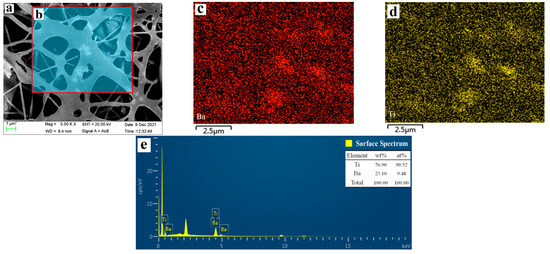SEM & EDS analysis of polyurethane composite fiber membrane. Reprinted/adapted with permission from Ref. [16]. 2022, Membranes. (a) Electron microscope picture, (b) Energy spectrum analysis of selected areas in (a), (c) Distribution of Ba element, (d) Distribution of Ti element, (e) Content ratio of Ba element and Ti element.