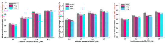 Figure 6 shows that the electro deformability of an actuating unit of the encapsulated SWNT electrode is generally better than that of PCG and CCG under all three loading voltages. The SWNTs coated on the surface of the polyurethane material formed a three-dimensional reinforced conductive network that brought uniform and permanent conductivity to the material with little impact on other properties of the material [17]. When the amount of BaTiO3 added is 1 phr, the electro deformability of the actuating unit encapsulated with SWNTs electrode exceeds that encapsulated with the other two electrodes by more than 13.8% at 20 kV. When the loading voltage is increased, the electro-induced deformation of the actuator unit encapsulated with SWNTs tended to increase compared with the other two electrodes.