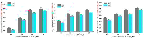 Table 4 lists the dielectric properties and dielectric sensitivity factors of polyurethane composite fiber membranes based on different parts of BaTiO3 filled. Table 5 shows the electro deformability data for the actuating unit encapsulated with different electrodes. Based on the data in Table 5, Figure 6 is drawn to compare the differences in electro deformability of different actuating units.
