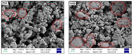 SEM micrograph of flexible electrode of PSI and SSD coating methods. The red circle means that the single-walled carbon nanotube electrode is agglomerated here.