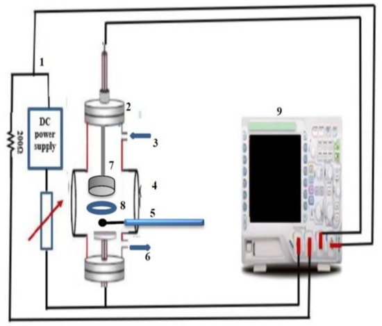 Schematic diagram of the experimental set-up of (1) DC glow discharge circuit, (2) evacuated chamber, (3) gas inlet, (4) window, (5) single probe, (6) rotary pump, (7) the plasma cell electrodes, (8) sample holder, and (9) oscilloscope.