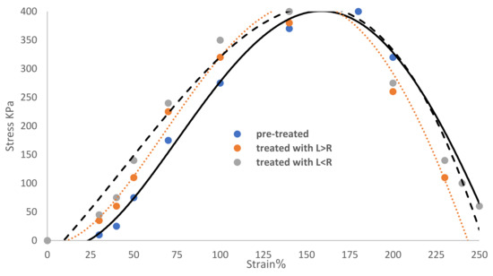 WT was calculated using the Microsoft Excel program by the area under the stress–strain curve from A up to the fracture (breaking point) D, representing the energy needed to extend the length of cotton fabric without damaging it and reflecting the mobility of the garment under deformation (up to fracture) [36,37]. WT increased as follows: 50,375 J/m3 for pre-treatment, 55,725 J/m3 for treatment with L > R, and 60,175 J/m3 for treatment with L < R, as shown in Equation (45):
