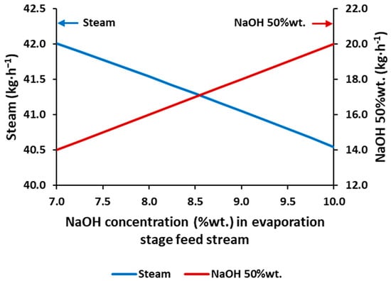 Figure 2 depicts the requirements of the industrial steam and the production of NaOH at the targeted concentration (50%wt.), obtained from the simulation, for a feed with concentrations on the range of 7–10%wt. (2.6–3.8 mol·L−1). As expected, an increase in the feed concentration favors the evaporation process in two ways: (i) industrial steam requirements are reduced, and (ii) the production of NaOH 50%wt. is increased. The production of NaOH 50%wt. is increased in the same proportion as the feed concentration is increased, whereas the industrial steam requirements are not proportional.