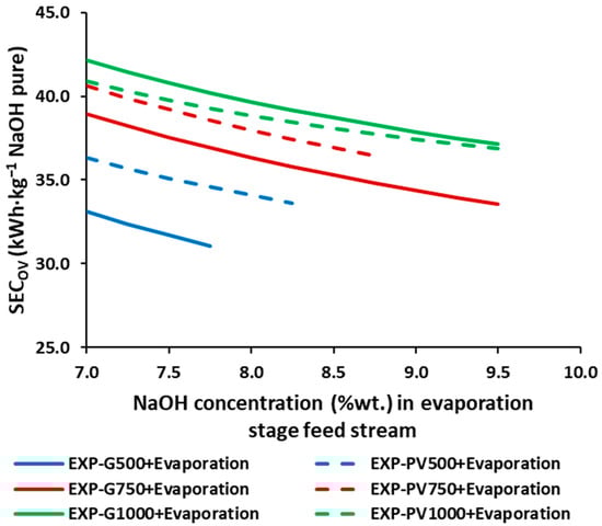 Thus, the integration of EDBMs with evaporation with the target of producing NaOH at commercial concentrations (50%wt.) is evaluated in terms of the SEC. In this sense, the feed NaOH concentrations to the evaporation in the range of 7–10%wt. are studied, which correspond with the maximum concentration experimentally achieved under different conditions.