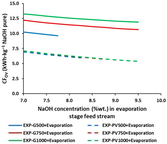 As plotted on Figure 5, the CFOV provides values between 5.38 kg CO2-eq.·kg−1 NaOH (9.5%wt. and PV1000 + Evaporation) and 13.27 kg CO2-eq.·kg−1 NaOH (7.0%wt. and G1000 + Evaporation). As with the SECOV, increasing the evaporation inlet concentration decreases the CFOV by up to 24.5%. Increasing the average current density increases the CFOV when operating with the grid mix (constant current density), while operating with solar PV energy, the CFOV are very similar, only slightly lower at the higher average current densities. Moreover, replacing the grid mix with solar PV energy allows reductions of up to 38.3%, 41.0%, and 54.7% for the average current densities of 500, 750, and 1000 A.·m−2, respectively.