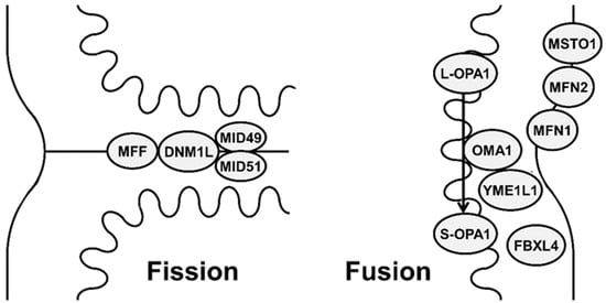 Mitochondria are dynamic organelles that constantly undergo fusion and fission, which provide mitochondria with a very interactive behavior [3]. Mitochondrial fission and fusion are active processes that occur continuously and simultaneously and are mediated by nDNA-encoded proteins that act on mitochondrial membranes. These specialized proteins include mechanical enzymes that alter the mitochondrial membranes physically and adaptor proteins that facilitate the binding of the mechanical enzymes to the organelles. Mitochondrial fission creates new mitochondria during cell division, allows the redistribution of mitochondria, and facilitates the segregation of damaged mitochondria, whereas mitochondrial fusion enables the exchange of intramitochondrial material between mitochondria. The balance between these two cellular processes determines the mitochondrial morphology and adapts it to the metabolic needs of the cells [4]. These two processes are crucial to optimize mitochondrial function and its bioenergetics abilities. Mitochondrial morphology reflects the respiratory activity of the cell. Maximum respiratory activity necessitates the fusion of the mitochondria, whereas, during cellular nutrient excess or cellular dysfunction, mitochondrial fragmentation occurs. In respiratory-active cells, mitochondria fuse to allow spreading of mitochondrial contents, counteract the effect of mitochondrial mutations that accumulate with aging, and optimize mitochondrial function. Mitochondria fragment in resting cells in order to remove damaged content by autophagy [5].