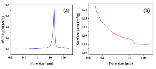 The pore size distribution of the porous SiC ceramic membrane was measured by an automatic mercury porosimeter (Type 60-GT, Quantachrome Co., LTD., Boynton Beach, FL, USA) using the mercury method. Figure 2a shows the relationship between the differential of the pore volume to the logarithm of the pore diameter and pore size. The differential varies significantly from 8.2 μm to 34.4 μm, and it first increases and then decreases, reaching a maximum of 0.7231 cc/g at the pore size of 20 μm, which represents that the pore size of the porous ceramic is 20 μm. As shown in Figure 2b, the surface area of the porous SiC decreased with the increase in the pore size. The maximum surface area was 0.2236 m2/g at the pore size of 0.02 μm, and when the pore size was 20 μm, the surface area reached 0.0102 m2/g.