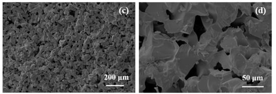 The fracture surface microstructure of the fired samples was observed by scanning electron microscopy (Type. SEM3200, Chinainstru and Quantumtech Co., Ltd., Hefei, China). Figure 2c,d shows the microstructure of the porous SiC ceramic membrane. In the enlarged structure, a stable structure with obvious interconnected pores between the SiC particles can be found. These interconnected pores are mainly generated by the burning of carbon powders and the stacking of SiC particles. Some smaller SiC particles are distributed between the original SiC particles, which is due to the new SiC generated by reactive sintering. The average pore size of the porous SiC ceramic membrane was measured by way of Nano Measure software (Ver. 1.2, Fudan University, Shanghai, China), and it was found to be 20.55 μm, which is basically consistent with that measured by the mercury method. In Ref. [26], Calderon et al. proposed an effective method to produce sawdust preforms, and the reactive infiltration of the carbon preforms had sufficient carbonization and permeable strength. The high-temperature treatment of bioCSw modifies the carbon structure, which changes the reactivity of the substrate with Si, and higher reactivity leads to the formation of fine and uniform SiC microstructures.