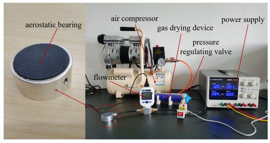 The bearing capacity of an aerostatic bearing is largely determined by the permeability coefficient of the porous media [27]. In order to measure the permeability coefficient of the porous SiC ceramic membrane, a measuring device for the permeability was designed and built, the device diagram of which is shown in Figure 3. It is mainly composed of an air compressor (Type OTS-550, Taizhou Outstanding Industry and Trade Co. Ltd., Taizhou, China), a gas-drying device (Type OA-GLQ, Qingdao Yibo Purification Equipment Co. Ltd., Qingdao, China), a pressure-regulating valve with a pressure gauge (Type IR1020-01, Shenglong Pneumatic Components Co. Ltd., Ningbo, China), a flowmeter (Type MF5708, Nanjing SENLOD Measurement and Control Equipment Co. Ltd., Nanjing, China), a power supply (Type.UTP3305, UNIT Corp., Tulsa, OK, USA), and an aerostatic bearing. The processed specimens of the aerostatic bearing based on the porous SiC ceramic are shown in addition. The pressure-regulating valve is used to control the gas-supply pressure by the air compressor, and the gas is dried through the gas-drying device. The different gas flows through porous materials are measured by a flowmeter under different gas-supply pressures, and the pressure difference before and after passing through the porous materials is recorded. The permeability coefficient is calculated by Equation (4), through Darcy’s law [28]: