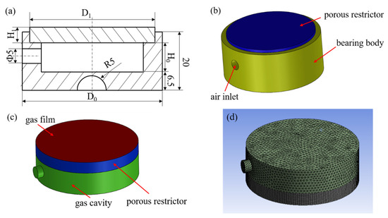 Detail drawing and simulation model of aerostatic bearing: (a) detail drawing; (b) geometric model; (c) fluid model; (d) meshing.