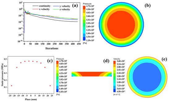 The residual convergence curve and flowing gas state under the conditions of Ps = 0.5 MPa, h = 10 μm, and φ = 2.78 × 10−13 m2: (a) residual convergence curve; (b) pressure contours of load surface; (c) two-dimensional distribution; (d) pressure distribution on profile of porous media; (e) gas-flow velocity of bearing clearance.