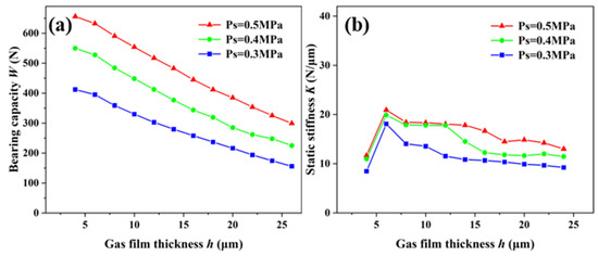 Under the permeability of 2.78 × 10−13 m2, the effects of the static characteristics on the aerostatic bearing with different gas-supply pressures were studied (Figure 7). The relationship between the bearing capacity and air-film thickness of the aerostatic bearing with gas-supply pressures of 0.3 MPa, 0.4MPa, and 0.5 MPa is shown in Figure 7a. It can be observed that the bearing capacity decreases with the increase in the air-film thickness under the same gas-supply pressure, and the decrease is slower. Under the condition of a constant air-film thickness, with the increase in the gas-supply pressure, the bearing capacity is greater. The gas-film stiffness is the change rate of the bearing capacity, and its accuracy is related to the value density of the bearing capacity. Figure 7b shows the relationship between the static stiffness and air-film thickness under different gas-supply pressures. With the increase in the gas-supply pressure, the change trend of the bearing capacity of the aerostatic bearing was more obvious, and the static stiffness also increased accordingly. When the gas-supply pressure was constant, the static stiffness increased first, and then decreased with the increase in the gas-film thickness, and a maximum static stiffness appeared with a gas-film thickness ranging from 4 μm to 8 μm. The results showed that the static characteristics of the aerostatic bearing can be improved by increasing the gas-supply pressure on the premise of ensuring good gas continuity.