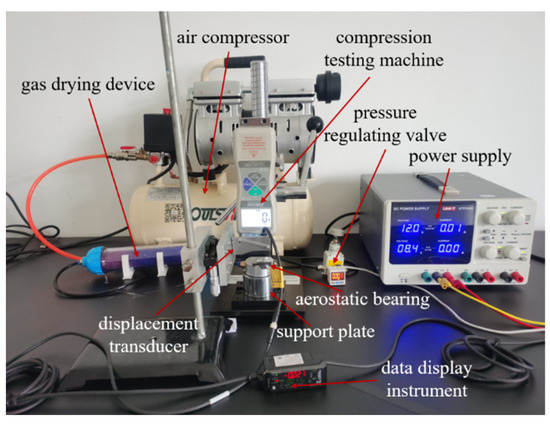 In order to study the static characteristics of the porous aerostatic bearing, a bearing-capacity-measurement system of the aerostatic bearing was built in this study. The concrete physical figure of the experimental measurement system is shown in Figure 9. The whole measuring system consists of a power supply (Type UTP3305, UNIT Corp.), air compressor (Type OTS-550, Taizhou Outstanding Industry and Trade Co. Ltd), gas-drying device (Type OA-GLQ, Qingdao Yibo Purification Equipment Co. Ltd), pressure-regulating valve with a pressure gauge (Type IR1020-01, Shenglong Pneumatic Components Co. Ltd.), displacement transducer (Type IL-S025, Keyence Corp., Osaka, Japan), data display instrument (Type IL-1000, Keyence Corp., Osaka, Japan), compression-testing machine (Type ZQ-32, Dongwan Zhiqu Precision Instruments Co. Ltd., Dongwan, China), support plate, and aerostatic bearing [33]. The porous SiC ceramic membrane with a permeability of 2.78 × 10−13 m2 was selected as the restrictor to study the static characteristics of the aerostatic bearing.