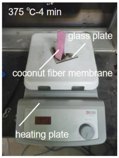 A heating plate was applied for carbonizing the coconut fiber membrane. First, cut the coconut fiber membrane (commercially available from Mengju Han company, China) to a proper size, and preheat the heating plate (HP550-S, Beijing, China), which is covered by a piece of glass, to the target temperature (325–400 °C) before carbonization. Second, place the coconut fiber membrane on the preheated glass for 3–5 min (Figure 1). Carbonize one surface of the coconut fiber membrane until it completely turns black. It should be noted that excessive carbonization is not allowed because, as a photothermal layer, the coconut fiber membrane needs to maintain a certain mechanical strength and stability (Supplementary Materials, Figure S1). For evaporators, the price of coconut fiber membrane is ~1.0 USD/m2, and simple carbonization operation does not significantly increase the cost.