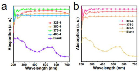 UV-Vis absorption spectra of the carbonized coconut fiber membranes: (a) different carbonized temperatures for 4 min and (b) different carbonized times at 375 °C.