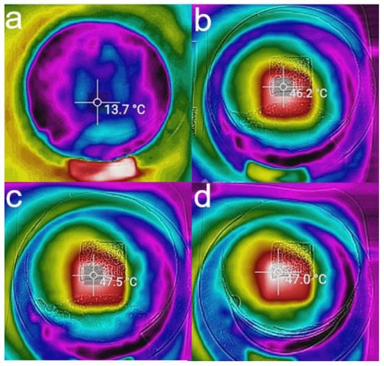 IR image of the carbonized coconut fiber membrane (375 °C, 4 min) under 3 suns: (a) initial, (b) 5 min, (c) 1 h, and (d) 2 h.