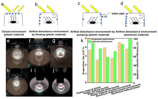 Scheme and solar vapor collection performance of different collection schemes. (a) Normally closed environment with serious optical loss. (b) Airflow disturbance by blowing with a fan. (c) Airflow disturbance by pumping with an air pump. (d) Enhancing condensation by high thermal conductivity aluminum side wall. Photos of corresponding collection schemes: (e) plastic closed environment, (f) blow, (g) pump, (h) blow + pump, (i) aluminum side wall, and (j) aluminum side wall with blow. (k) Solar evaporation rate and apparent collection efficiency of different collection schemes.