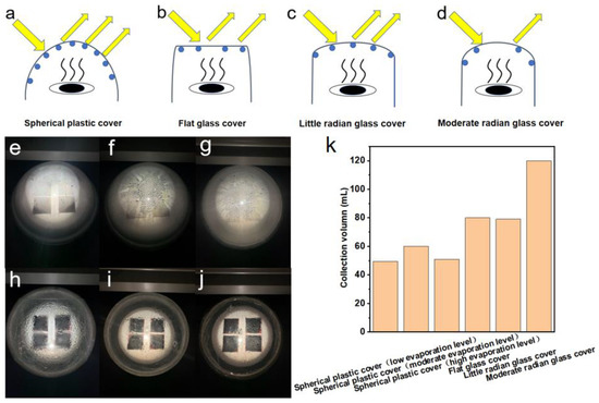 Scheme and solar vapor collection performance of different top covers. (a) Spherical plastic cover with serious optical loss. (b) Flat glass cover with large droplets. (c) Small radian glass covered with large droplets. (d) Moderate radian glass cover with mist. Photos of corresponding top covers: spherical plastic cover with (e) low, (f) moderate, (g) high evaporation levels; (h) flat glass cover, (i) small radian glass cover, and (j) moderate radian glass cover with moderate evaporation level. (k) Collection performance of different top covers.