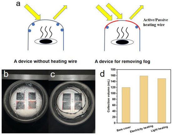 The condensation of droplets on the top cover is an inevitable problem for the upward evaporation scheme. Droplets not only refract light but are also not conducive to reducing indoor vapor pressure, which seriously affects seawater desalination’s evaporation and collection efficiency. Hence, it is an urgent problem that needs to be solved. Actually, when optimizing the thermal conductivity material, it is also noted that the droplets do not condense in the middle region due to being close to the light source. There are a large number of droplets attached at the edge. This indicates that the location of the droplet condensation can be controlled through the energy gradient (Figure 8a). Thus, active and passive heating wires are used to remove the water droplets, including heating elements and fixed fittings. The heating wire is arranged on the outer surface of the transparent cover in spiral mode with equal spacing on the outer surface and fixed, which is conducive to the uniform distribution of the heating wire energy. The setting of the defogging unit is direct to the sunlight so that the light source can illuminate the surface of the defogging unit as much as possible. Such a setting is expected to effectively increase the heating efficiency. In addition, the defogging unit can also be wrapped with a black light-absorbing material to facilitate the conversion of light and heat energy, which can be used as a passive structure. Using four photothermal layers with an area of 6.5 × 6.5 cm2 for evaporation under 1 sun, 159 mL of water can be collected in a day, which is 39 mL more than the natural collection under the same conditions, and the apparent collection efficiency is improved by 1.33 times, showing that the collection effect is significantly enhanced (Figure 8b). In addition, it is also noted that the winding mode of the heating wire also affects the collection effect. When the heating wire is wound at equal spacing, the collection effect is more obvious than that of a single loop, but if the arrangement is too dense, it will affect the incidence of light. When the defogging unit wrapped in black material is used, the collection volume is 150 mL a day, which is not as high as the heating energy scheme of the electric heating wire, but it also has a good effect: the apparent collection efficiency is increased by 1.25 times (Figure 8c). Compared with the active structure of the heating wire, the passive structure has the advantage of energy saving and environmental protection. In particular, the passive defogging structure can be set outdoors. The collection volume of different heating wire schemes is summarized in Figure 8d.