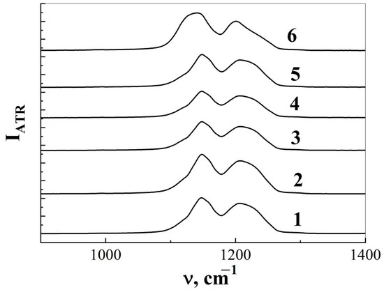 At the same time, there were no noticeable changes in the position of the maximum and intensity of wide structureless bands with maxima at ~800 and ~853 cm−1, which are caused by fluctuations of the –CF bond in the amorphous disordered phase and bending vibrations of the –CF2 groups (Figure 4, Table 2).