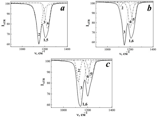 Approximation of the infrared spectra of the disturbed total internal reflection of the initial (a) and irradiated with accelerated xenon ions up to 108 and 1011 cm−2 (b,c, respectively) thermoradiationally modified polytetrafluoroethylene. 1 (a–c) Experimental data; 2–4 (a–c), 5 (b,c) maxima of approximating random functions; 5 (a), 6 (b,c) result of approximation.