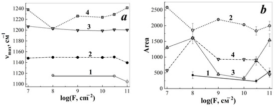 Change in the position of maxima (a) and peak areas (b) of oscillatory modes 1116 (1), 1147 (2), 1206 (3), 1238 (4) cm−1 in the infrared spectra of the disturbed total internal reflection of thermoradiationally modified polytetrafluoroethylene depending on the fluence of xenon ions with an energy of ~1 MeV/nucleon.