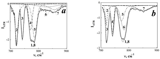 Fragment of the infrared spectrum of the disturbed total internal reflection of the initial (a) and irradiated with accelerated xenon ions to fluxes of 108 and 1011 cm−2 thermoradiationally modified polytetrafluoroethylene (b,c, respectively) in the spectral range of 700–900 cm−1. 1 Experimental data; 2–6 (a–c), 7 (b,c), maxima of approximating Voigt random functions; 7 (b,c), 8 (a,b) approximation result.
