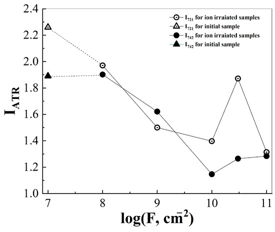 The detected decrease in the intensity of the 721 cm−1 band, which occurred with an increase in the fluence of xenon ions, may be due to the removal of surface –CFO groups as a result of radiation-chemical processes in TPM-PTFE (Figure 5). In the fluence region of 108–1010 cm−2, a decrease in the intensity of the vibrational mode of 742 cm−1 was simultaneously observed, the origin of which was associated with the oscillations of the terminal –CF3 groups. With fluences 3 × 1010–1011 cm−2 the oscillatory mode 742 cm−1 was stabilized.