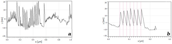 It was found by AFM that the morphology of the surface of unirradiated xenon-ion-exfoliated TPM-PTFE film is defined by lamellar structures having the form of crystallite layers, which are located perpendicular to the direction of orientation stretching of the film sample (Figure 6a and Figure 7). The crystallites had a conical shape with height y = 19–20 nm and width at the base ~16,8 nm, the distance between the tops of individual protrusions is 16.7 nm. Probably, the same distance between crystallite layers is a consequence of self-organization processes developing during the orientation of crystallites in the field of tensile stresses.
