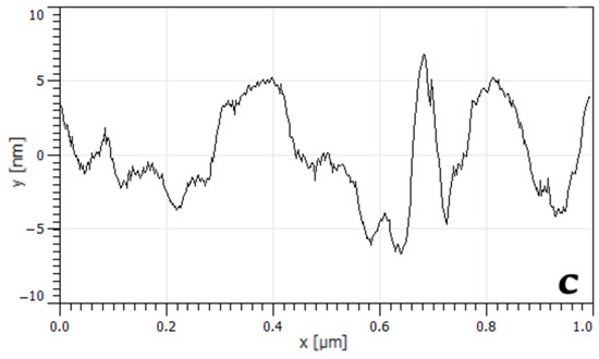 The effect of xenon ions with an energy of 1 MeV/nucleon at a fluence value of ~108 cm−2 led to huge changes in the surface roughness parameters of TRM-PTFE (Table 3, Figure 7). The average roughness of Ra decreased by ~5.94 times, and the rms roughness of Rq decreased ~6.56 times compared to non-irradiated TRM-PTFE. At the same time, the maximum roughness height Rt, and Rz, decreased by ~7.62 and 7.72 times, respectively.