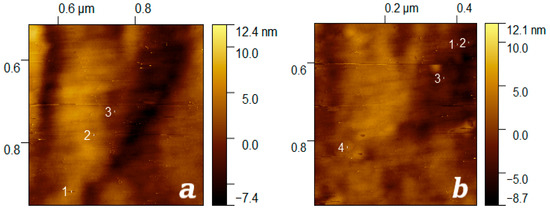 Enlarged fragments of a topographic image of the surface of a thermoradiationally modified polytetrafluoroethylene film (Figure 6b) irradiated with a stream of xenon ions up to 108 cm−2: 1–3 (a), 1–4 (b)—tracks of xenon ions are indicated by white line segments.
