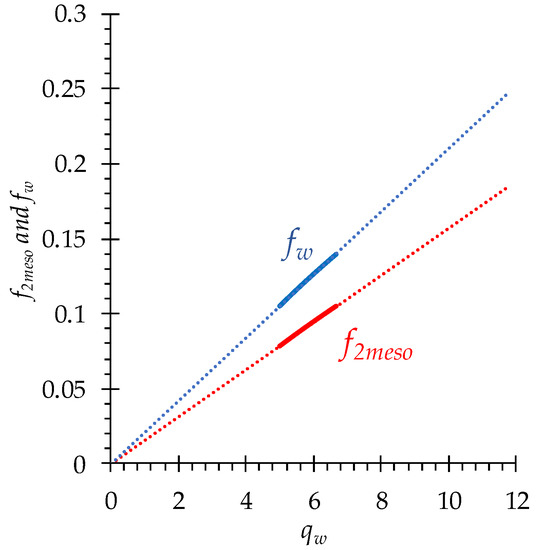 f2meso and fw as functions of the amount of free water, qw, in the MA-41 membrane. The range of qw and calculated f2meso and fw values corresponding to the solution concentrations from 0.1 to 4 mol/L are shown by solid lines. Extrapolation of simulation data is shown by dots.
